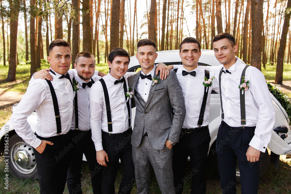 Group wedding photography. Elegant groom in grey suit with Very well made.