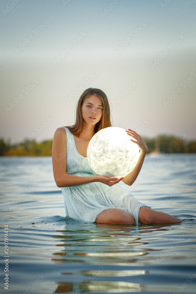 Attractive young girl in a blue dress sits on the water and holds Very well made.