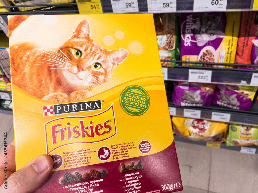 BELGRADE SERBIA MAY 19 2021 Friskies logo on a pack of cat Very well made.